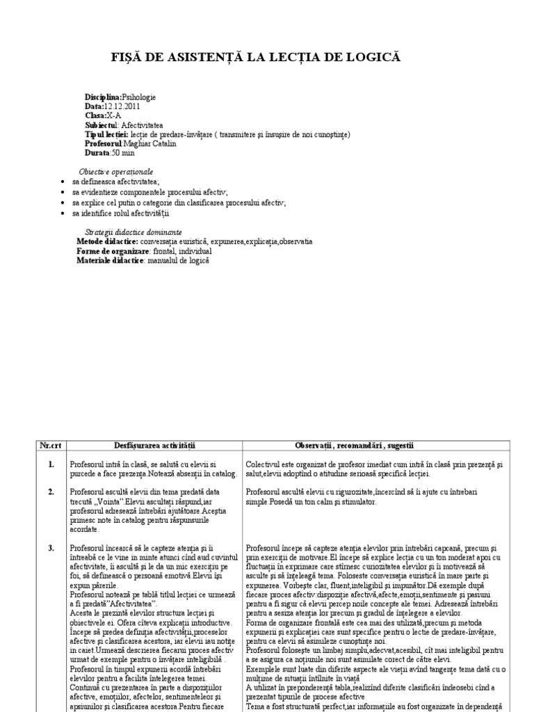 Fisa De Observare A Lectiei